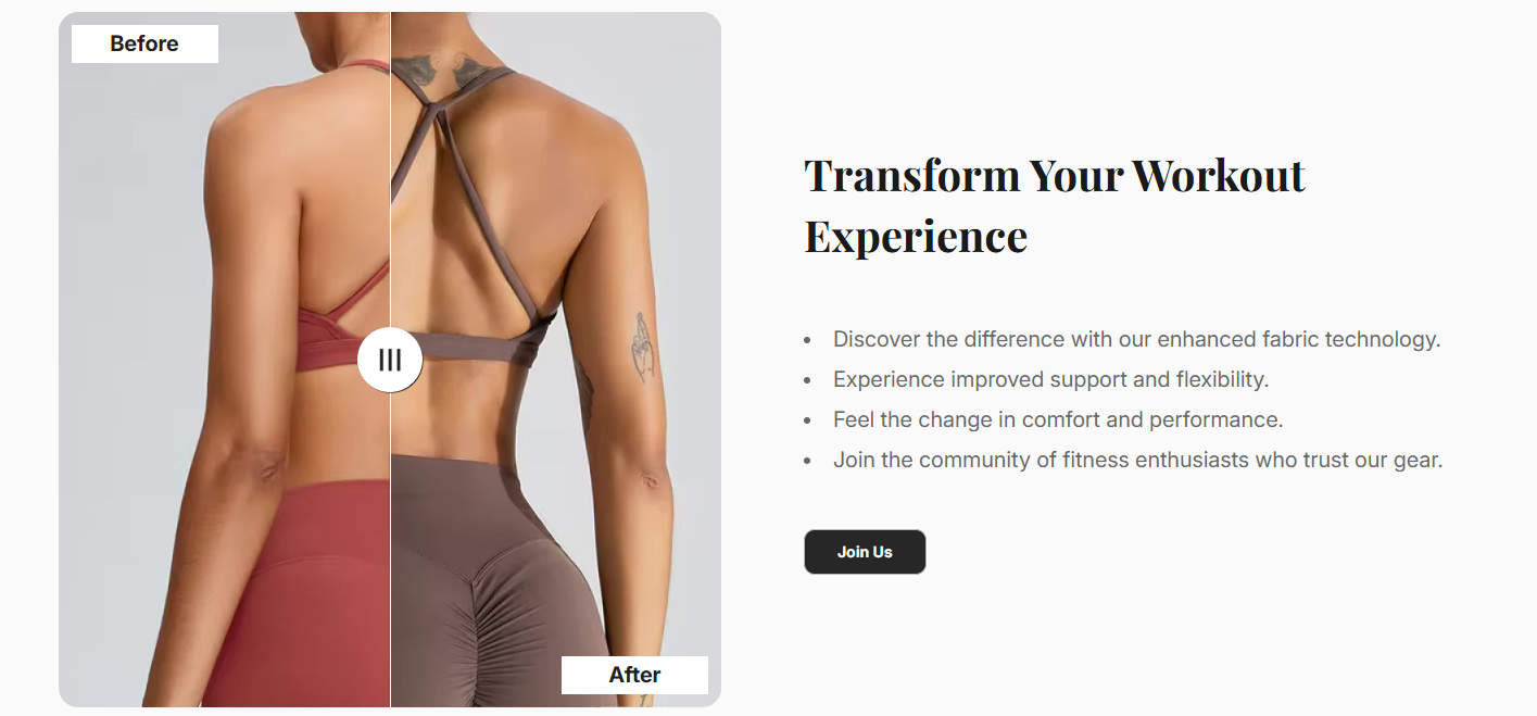 The Before/After Content section is designed to showcase a comparison between two images (e.g., before and after) with additional content such as a heading, description, and a call-to-action button. This section is ideal for highlighting transformations, product improvements, or any other comparative content.