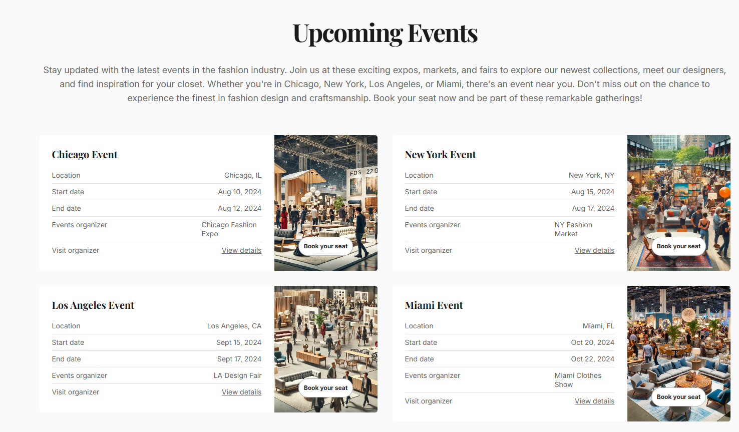 The "Events List" section is designed to display a grid of events, allowing visitors to view event details such as dates, locations, and organizers, and to register or get more information.