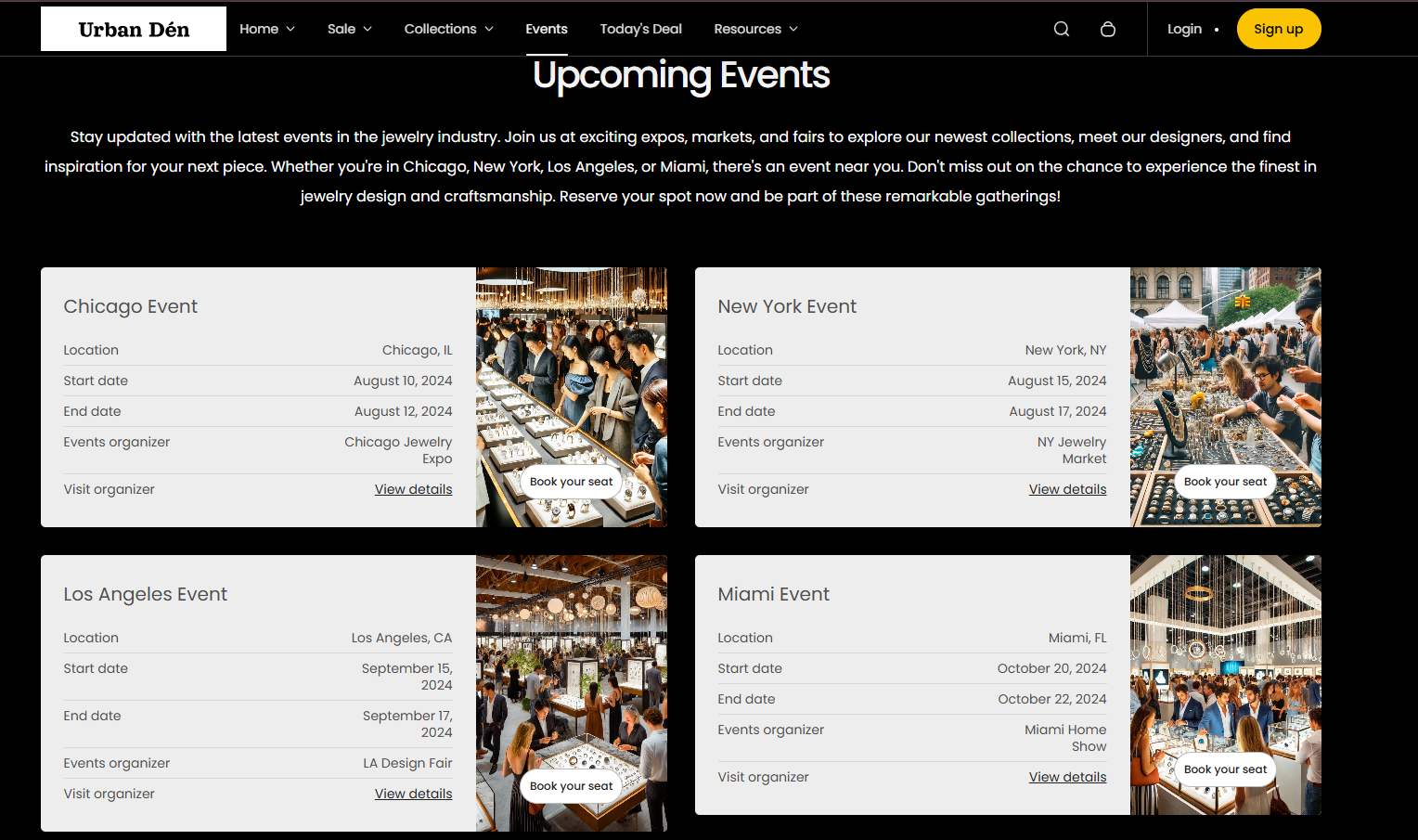 The Events List section is designed to showcase upcoming or past events in a structured, grid-style layout. Each event block can include a heading, image, dates, location, organizer details, and a call-to-action button, making it ideal for promoting store events, webinars, pop-ups, or workshops.