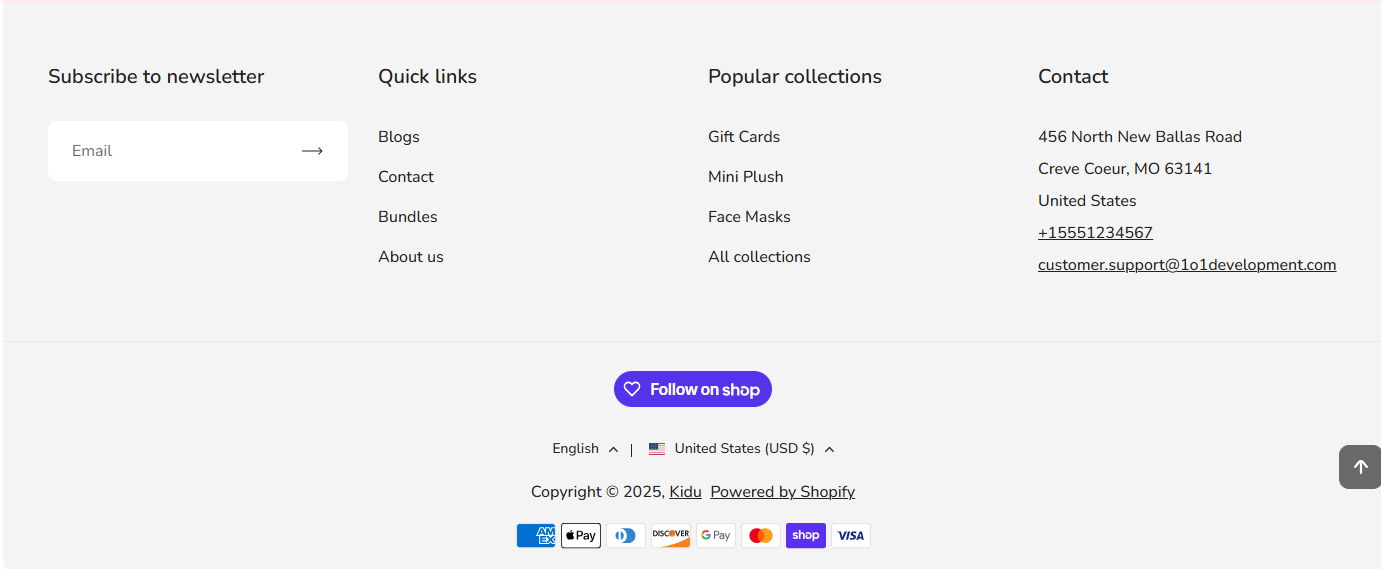 The Footer section is an important part of the store that can be used to communicate information such as contact details, legal information and site navigation links. The footer displays on all pages in your theme.